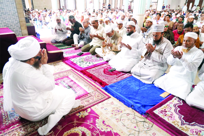 Senior Imam of Baitul Mukarram National Mosque Mufti Md Mizanur Rahman conducts a doa and munajat at Baitul Mukarram National Mosque on Tuesday, seeking the wellness of the injured and eternal peace for the departed souls of students and people who embraced martyrdom during the July Uprising.
