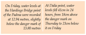 In Lalmonirhat, the Teesta River, which had surged above the danger level for several days, dropped sharply overnight. At Dalia point, water levels fell 41cm in 24 hours, from 18cm above the danger mark on Thursday to 23cm below it on Friday. The rapid decline has begun draining floodwaters from most riverbank areas, allowing residents to resume daily activities.